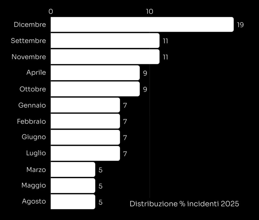Sul piano temporale, dicembre risulta il mese più colpito dalle compromissioni del 2025, in coincidenza con il periodo di ferie natalizie, quando la riduzione dei presidi e del personale può aumentare la vulnerabilità operativa delle aziende.
