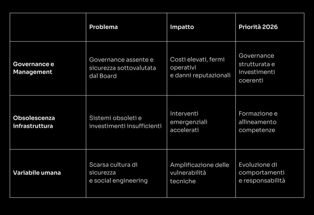 Ecco perché, tra le azioni prioritarie consigliate per il 2026, c’è innanzitutto rafforzare governance e responsabilità interne, unire formazione, cultura e consapevolezza all’orchestrazione di tecnologie, processi e competenze umane, adottare controlli identity-first, applicare una gestione delle patch risk-based, garantire supervisione continua di cloud e SaaS con backup e playbook di incident response. L’obiettivo deve essere passare da una sicurezza reattiva a una difesa proattiva e strategica, soprattutto nelle aziende più grandi che gestiscono supply chain più lunghe.